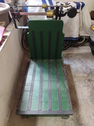 Báscula antigua de pesaje con estructura metálica y plataforma de madera. - Diseño clásico. - Detalles en color verde y negro. - Barra de pesaje con marcas. Se encuentra a 115Km de Valencia, en un pueblo de Albacete. Venta en persona.