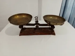 Báscula antigua con un diseño clásico y robusto. Ideal para coleccionistas o como elemento decorativo. - Plato de latón. - Base de hierro oxidado.
