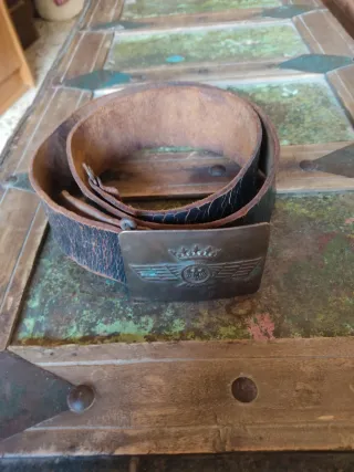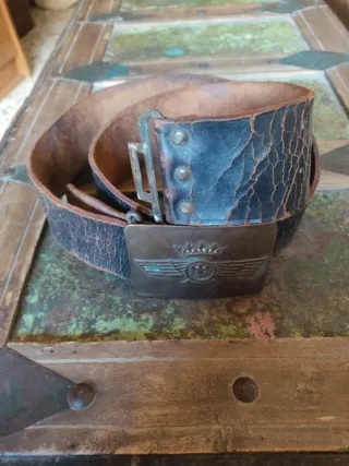Auténtico cinturón de aviación de la época de la Guerra Civil Española. Una pieza histórica con una hebilla metálica detallada. - Hebilla con emblema de aviación y corona. - Correa de cuero desgastada por el tiempo.