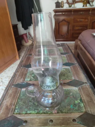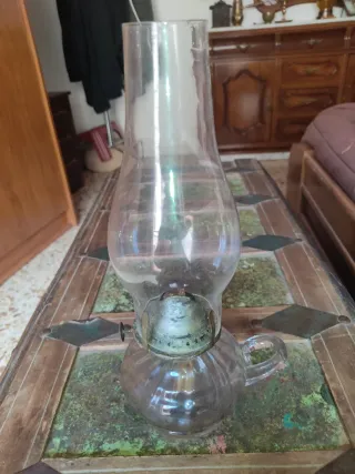 Quinqué de aceite antiguo, un modelo poco común y en perfecto estado. - Base de cristal con asa. - Quemador metálico. - Cúpula de cristal.