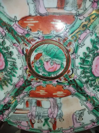 Precioso plato antiguo de porcelana china, originario de Macaos. Presenta un diseño detallado con escenas y motivos florales. - Decoración pintada a mano. - Tonos verdes, rosas y naranjas. - Borde festoneado.