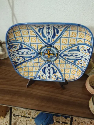 Fuente de loza con un diseño único, hecha y pintada a mano. - Motivos florales y geométricos en azul y amarillo. - Borde decorado.