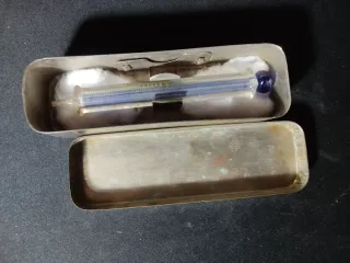de cristal antiguo con detalles en azul. Se encuentra en su estuche metálico. - Material: Cristal y metal. - Color: Azul.