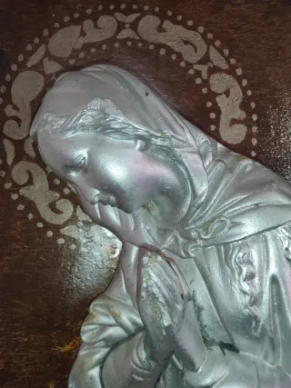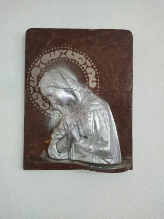 Preciosa talla en madera de la Virgen María, con un diseño clásico y detallado. De principios del siglo XX Mide 31x83 - Representación de la Virgen María en actitud de oración. - Marco de madera con detalles decorativos. - Acabado plateado en la figura.