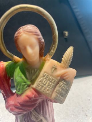 Figura religiosa de San Juan Bautista. Representa al santo con un libro y una pluma. - Detalles pintados a mano. - Halo dorado. - Base negra. Creada en resina irrompible.