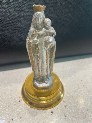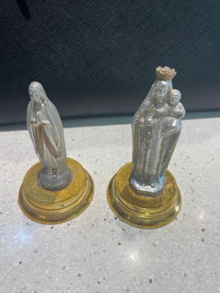Conjunto de dos figuras religiosas de la Virgen María. Una figura es de la Virgen sola y la otra es de la Virgen con el Niño Jesús. Una de ellas está carente de corona; habría que hacérsela - Base dorada. Contienen iman en sus bases para dar estabilidad y firmeza - Material metálico, en plata decorado con detalles de calidad en oro, Creo puede ser Virgen del Carmen y Virgen de los dolores