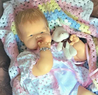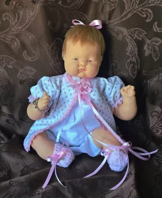 Muñeca vintage estilo años 60, modelo Baba Dear de Vogue. Mide aproximadamente 18 pulgadas. - Vestido blanco con estampado floral rosa. - Detalles de encaje y cintas rosas. - Gorrito y patucos a juego. - Pulsera decorativa en la muñeca.