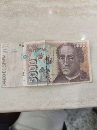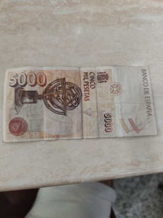 Billete de 5000 pesetas del Banco de España. - Diseño con un globo terráqueo. - Inscripción CINCO MIL PESETAS.