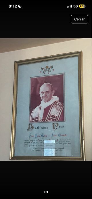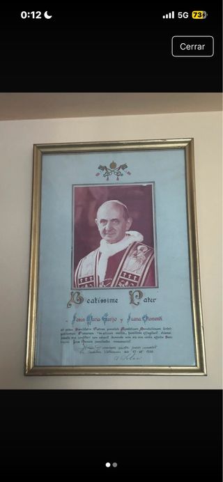 Marco antiguo con retrato del Papa Pablo VI y su bendición. - Retrato del Papa Pablo VI. - Incluye texto de bendición. - Marco dorado.