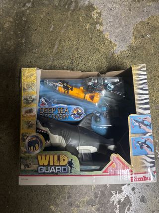 Set de juego Wild Guard Deep Sea Discovery con tiburón y buceador. - Figura de tiburón. - Figura de buceador con equipo. - Vehículo submarino amarillo.