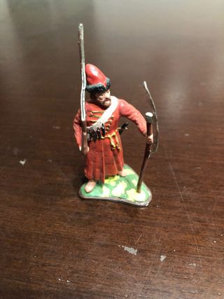 Figura de colección de un soldado medieval de plomo. Detallada y pintada a mano. origen Rusia - Incluye lanza, espada y escudo. - Base decorada con hierba.