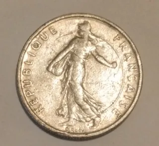Moneda de Francia con valor de 1/2 Franco, acuñada en el año 1966. Presenta el diseño de la República Francesa. - Diseño de la República. - Año de acuñación: 1966. - Valor: 1/2 Franco.