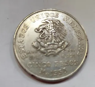 Moneda conmemorativa mexicana de cinco pesos del año 1953. Presenta un diseño detallado. Sus características principales son: País: México Denominación: 5 Pesos Año: 1953 Composición: Plata Ley 0.720 (72% plata) Peso: 18 gramos Diámetro: 35 milímetros Anverso: Muestra el Escudo Nacional Mexicano (águila devorando una serpiente sobre un nopal) con la leyenda "ESTADOS UNIDOS MEXICANOS". Reverso: Muestra el gorro frigio radiante, la balanza de la justicia, el valor nominal "CINCO PESOS" y la ley "0.720". - Canto liso. - Diseño de perfil con laureles.