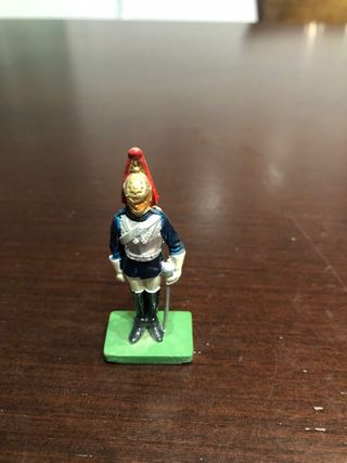 Figura de colección de un soldado de plomo con uniforme militar. - Detallado uniforme azul oscuro y armadura plateada. - Casco dorado con penacho rojo. - Base verde.