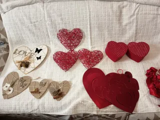 Lote de adornos decorativos en forma de corazón, perfectos para San Valentín o cualquier ocasión especial. - Adornos de hilo rojo. - Corazones de cartón rojo. - Corazones de madera y tela. - Cajas de regalo en forma de corazón.