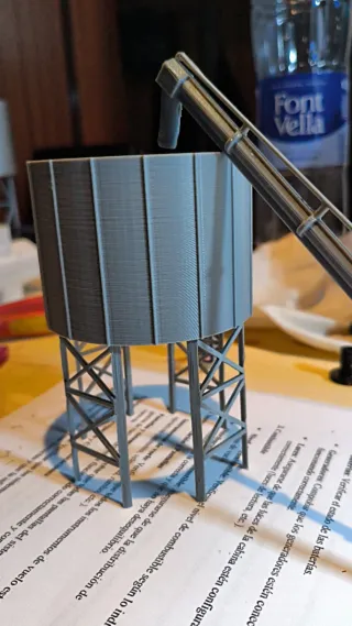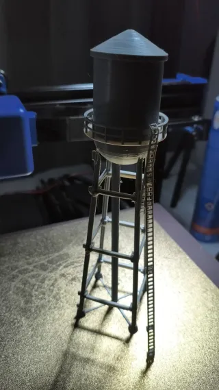 Piezas impresas en 3D. - Modelo de torre de agua. - Escalera de acceso. - Estructura de soporte.