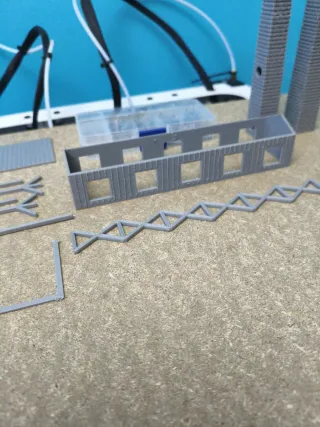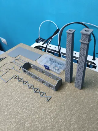 Conjunto de piezas impresas en 3D, ideales para maquetas o proyectos de construcción. - Chimeneas de ladrillo - Estructura de edificio - Escalera de celosía - Piezas de montaje - Caja organizadora