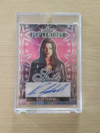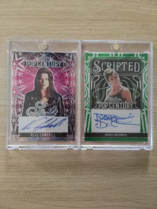 Tarjetas coleccionables con autógrafos de Neve Campbell y Denise Richards. - Autógrafo de Neve Campbell. - Autógrafo de Denise Richards. - Tarjetas de Pop Century y Scripted.