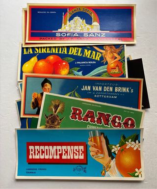 9 preciosas etiquetas originales de naranjas, antiguas. Ver fotos adicionales. Se venden tal cual muestro en las fotos, en muy buen estado, con señales de uso normales. Años 1940-1960. La mas grande mide: 26 x 30 cm., son todas mas o menos del mismo tamaño, ver fotos. Se pueden unificar todos los articulos que le interesen en un anuncio para hacer un solo envio, de esta manera solo pagará unos gastos de envio por correo certificado, consulteme. Cajon plast. 6