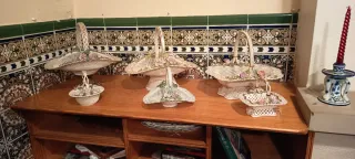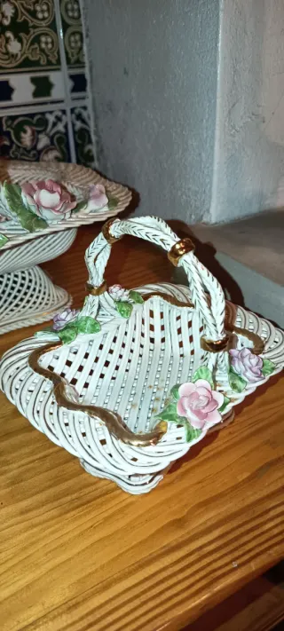 Conjunto de cestas decorativas de cerámica, elaboradas artesanalmente. - Diseño único y delicado. - Adornadas con flores de cerámica. - Base con encaje de cerámica.