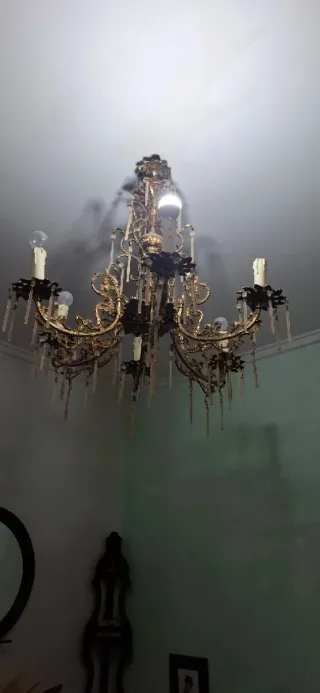 Elegante lámpara de araña de estilo antiguo con un acabado dorado. Su diseño intrincado añade un toque de sofisticación a cualquier espacio. - Estructura metálica dorada. - Múltiples brazos con detalles ornamentales. - Adornos colgantes de cristal.