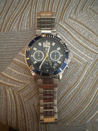 Elegante reloj de pulsera de la marca Mercedes Benz. - Diseño cronógrafo con esfera azul. - Correa de acero inoxidable. - Bisel giratorio azul.