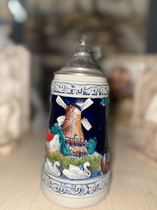 Jarra de cerámica alemana con un diseño detallado. - Representación de un molino y cisnes. - Tapa metálica con detalles ornamentales. - Base con diseño labrado.