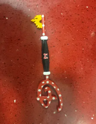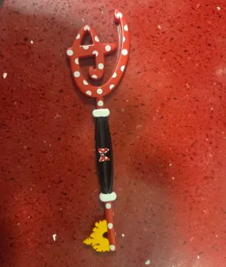 Llave decorativa de madera con diseño de Disney. - Diseño de lunares rojos con blanco. - Detalle de Minnie Mouse en el mango. - Figura de Mickey Mouse en la parte superior.