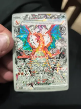 Carta coleccionable de Pokémon, Charizard EX. - Poder: 330 HP. - Habilidad: Reino Infernal. - Ataque: Oscuridad Ardiente.