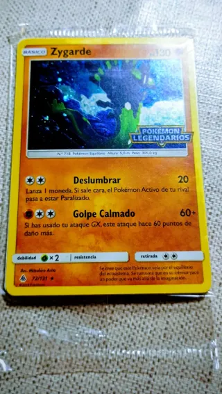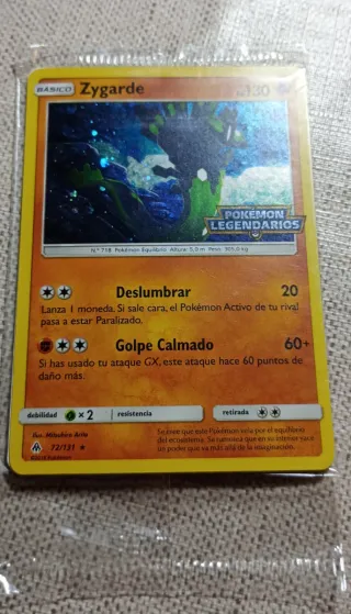 Carta Pokémon de Zygarde, número 72/131. - Tipo: Básico - Ataques: Deslumbrar (20) y Golpe Calmado (60+). - Debilidad: x2 - Resistencia: Ninguna - Retirada: 2 energías - Ilustrador: Mitsuhire Arile