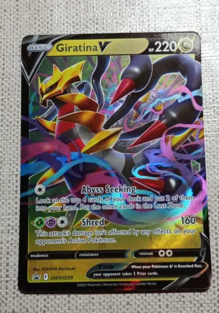 Carta Pokémon de Giratina V, edición SWSH259. - Tipo: Básico - HP: 220 - Habilidad: Abyss Seeking - Ataque: Shred (160 de daño) - Ilustrador: PLANETA Mochizuki