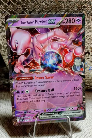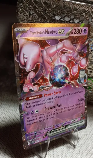 Carta coleccionable de Pokémon, Team Rocket's Mewtwo EX. - Tipo: Básico - HP: 280 - Habilidad: Power Saver - Ataque: Erasure Ball (160+) - Debilidad: Psíquico x2 - Resistencia: Lucha -30 - Retirada: 3 Energía - Regla Pokémon EX: Al ser noqueado, el oponente toma 2 cartas de Premio.