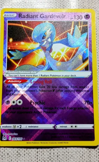 Carta Pokémon de Radiant Gardevoir, parte de la expansión. - Número de carta: 069/196. - Ilustración de Ryuta Fuse. - Tipo Psíquico.
