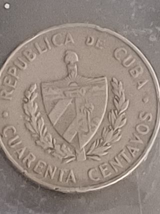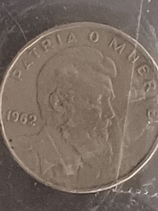 Moneda de 40 centavos cubanos conmemorativa del año 1962. En el anverso se observa el perfil de un hombre y la inscripción PATRIA O MUERTE. - Año: 1962 - Denominación: 40 centavos cubanos