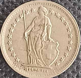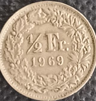 Medio franco suizo del año 1969. La moneda muestra una figura femenina con un escudo. - Año: 1969 - Denominación: 1/2 Franco Suizo - Diseño: Figura femenina con escudo y lanza