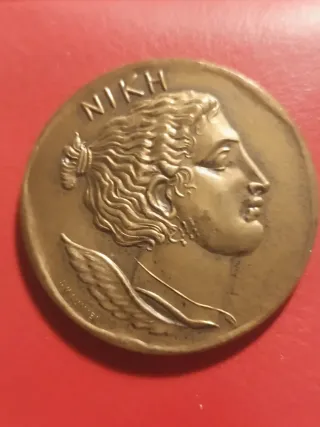 Medalla de bronce con la figura de NIKH, la diosa griega de la victoria, con alas. - Inscripción NIKH en la parte superior. - Detalle de ala. - Firma AMMANUEL en la parte inferior izquierda.