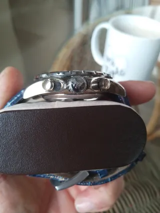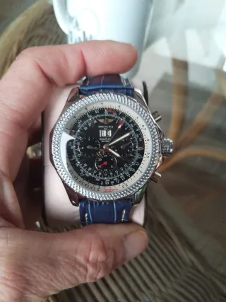 Elegante reloj Breitling Bentley con cronógrafo automático. Su diseño combina sofisticación y funcionalidad. - Esfera negra. - Correa de piel azul. - Bisel con detalles. - Ventana de fecha.