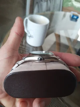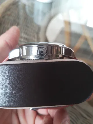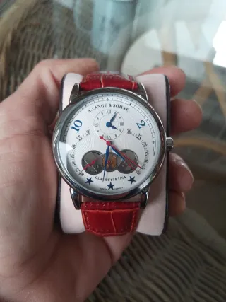 Elegante reloj de pulsera con correa de piel roja. - Esfera blanca con detalles en azul. - Indicadores de horas y minutos. - Correa de piel con acabado texturizado.