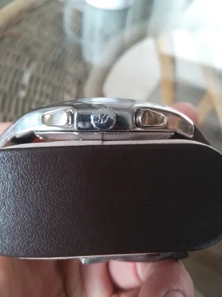 Elegante reloj Breitling Chronometre con correa de cuero. - Esfera blanca con detalles texturizados. - Subesferas para cronógrafo y fecha. - Caja rectangular de acero inoxidable. - Correa de cuero marrón con pespuntes blancos.