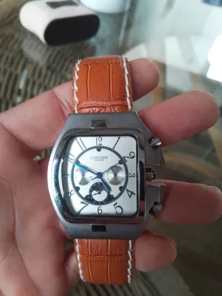 Elegante reloj de pulsera de la marca Cartier París. Presenta una correa de cuero marrón con un diseño texturizado y costuras blancas. - Esfera plateada con números arábigos. - Indicadores de subesfera y fase lunar. - Bisel cuadrado con detalles en los laterales.
