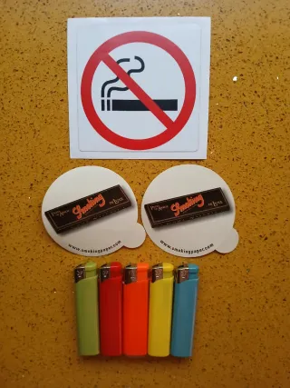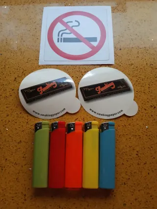 Dos pegatinas Smoking paper Deluxe de 8 cms. de diámetro c/u. Otra de prohibición de fumar y 5 mecheros nuevos con gas. ENVÍO EN 24H.