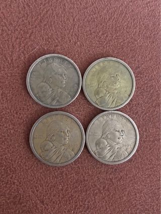 Conjunto de cuatro monedas antiguas para coleccionistas. - Diseño con figura femenina y niño. - Año 2000 visible en algunas piezas. - Borde con inscripción LIBERTY. -one dollar united states of america