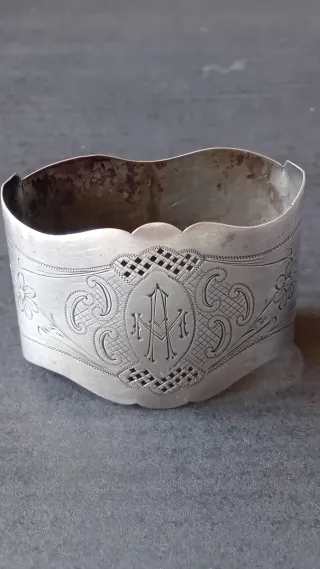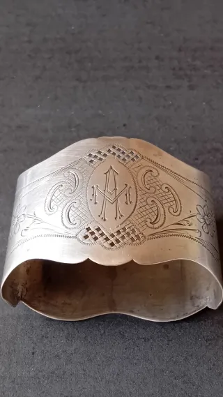 Elegante servilletero antiguo con un diseño grabado y un monograma central. - Material: Plata 800. - Decoración: Grabados florales y un monograma. - Estilo: Antigüedad, coleccionismo. Servilletero de plata antiguo, hecho a mano, es un artículo de colección, material de plata 800 , con marcas de pureza y de fabricante. El estilo presenta un cincelado y grabado detallado, incluyendo un monograma con las iniciales "AM". El diseño es festoneado, con un borde superior e inferior ondulado, y muestra signos de uso y pátina debido a su antigüedad.