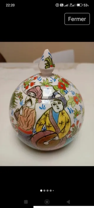 Precioso jarrón de cerámica con tapa, de estilo turco otomano. Firmado en la base. 13×10 cm - Decorado a mano con motivos florales y figuras. - Diseño tradicional Kutahya.