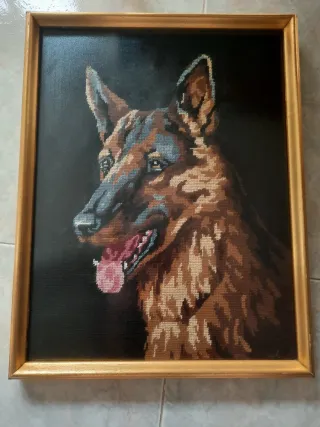 Precioso cuadro vintage de medio punto, PETIT PUA o PETIT POINT con la imagen de un pastor alemán. Ideal para amantes de los perros. Es un cuadro grande de 49 x 39 y tiene mucho trabajo. - Técnica: PETIT PUA, PETIT POINT o medio punto. - Motivo: Pastor alemán. - Marco incluido y cristal antirreflejos. El marco no está perfecto y tiene varios defectos. Mirar las fotos. Cuadro punto de cruz
