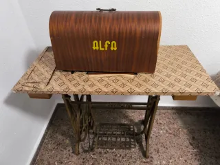 Máquina de coser antigua de la marca Alfa, con su tapa de madera. - Tapa de madera con el logo ALFA en amarillo. - Estructura metálica. - Pedal de pie. - Cubierta de tela con estampado.