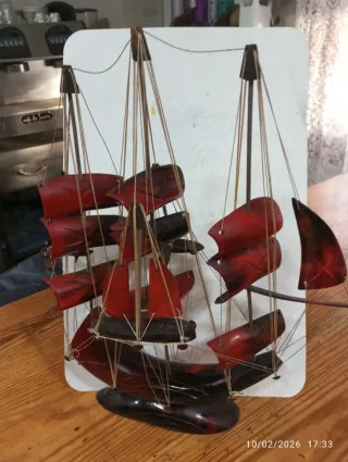 Barco decorativo de estilo vintage. - Diseño con velas rojas y negras. - Base a juego.
