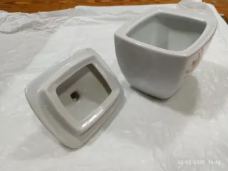 Azucarero de cerámica blanca con un diseño floral delicado. Perfecto para añadir un toque de elegancia a tu mesa. - Diseño cuadrado. - Tapa con asa. - Decoración de flores en tonos rosados y anaranjados.