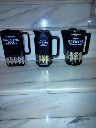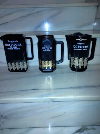 Conjunto de tres jarras de whisky Seagram's 100 Pipers. 10€ cada una - Diseño en color negro con detalles dorados. - Cada jarra presenta la etiqueta Seagram's 100 Pipers De Luxe Scotch Whisky. - La jarra central tiene la inscripción Aged 8 Years.
