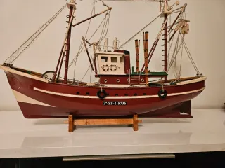 Detallada maqueta de un barco pesquero, ideal para coleccionistas. - Diseño clásico en color rojo y blanco. - Soporte de madera incluido para exhibición.